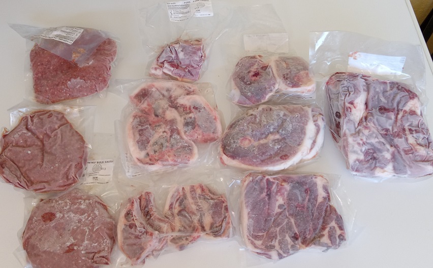 3 ground country sausage, 3 pork chops, 3 ham or shoulder steaks, roast/Boston butt